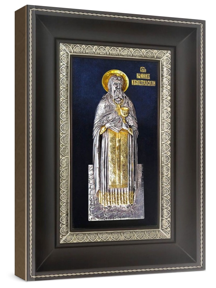 Икона иоанн кронштадтский (18х29), серебро. Икона ручной работы. Образ Святого выполнен из металлической основы, покрытой серебром (толщиной 15 микрон) и золотом (толщиной 2 микрона) методом гальванопластики. Рама изготовлена из ценных пород дерева (ясень) и покрыта лаком. Размер иконы: 18,5x29 см. Производство: Россия.