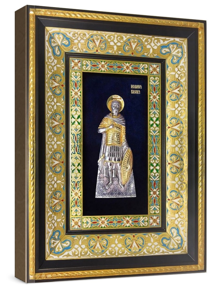 Икона иоанн воин (29х40), серебро. Икона ручной работы. Образ Святой выполнен из металлической основы, покрытой серебром (толщиной 15 микрон) и золотом (толщиной 2 микрона) методом гальванопластики. Рама изготовлена из ценных пород дерева (ясень), украшена холодной эмалью и покрыта лаком. Размер иконы: 29х40 см. Производство: Россия.