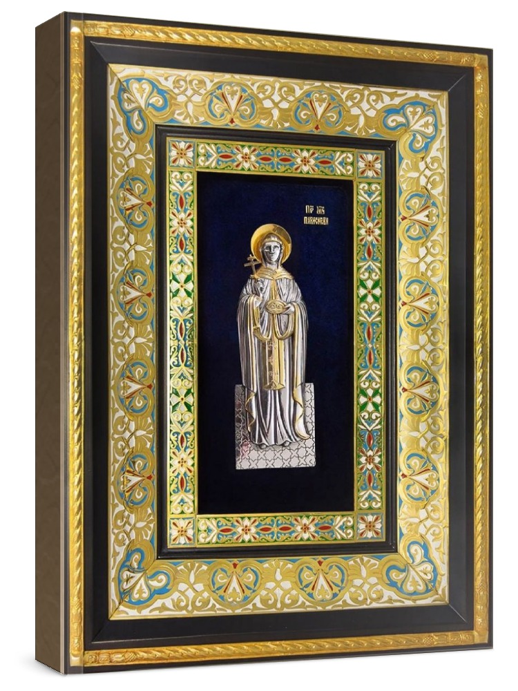 Икона параскева римская (29х40), серебро. Икона ручной работы. Образ Святой выполнен из металлической основы, покрытой серебром (толщиной 15 микрон) и золотом (толщиной 2 микрона) методом гальванопластики. Рама изготовлена из ценных пород дерева (ясень), украшена холодной эмалью и покрыта лаком. Размер иконы: 29х40 см. Производство: Россия.