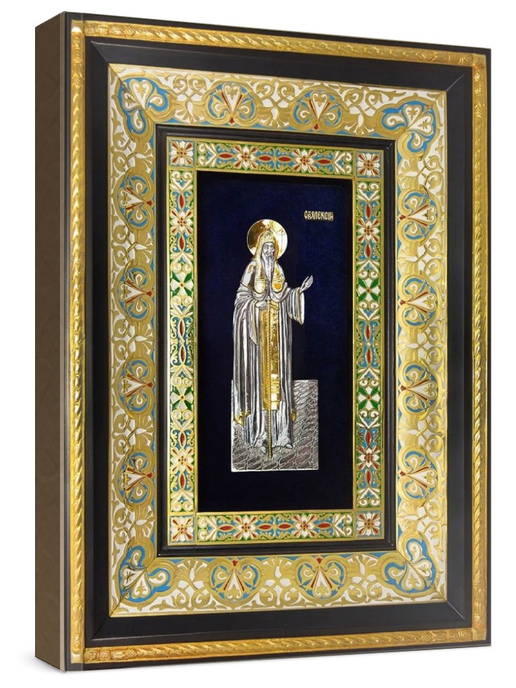 Икона алексий московский (29х40), серебро. Икона ручной работы. Образ Святой выполнен из металлической основы, покрытой серебром (толщиной 15 микрон) и золотом (толщиной 2 микрона) методом гальванопластики. Рама изготовлена из ценных пород дерева (ясень), украшена холодной эмалью и покрыта лаком. Размер иконы: 29х40 см. Производство: Россия.