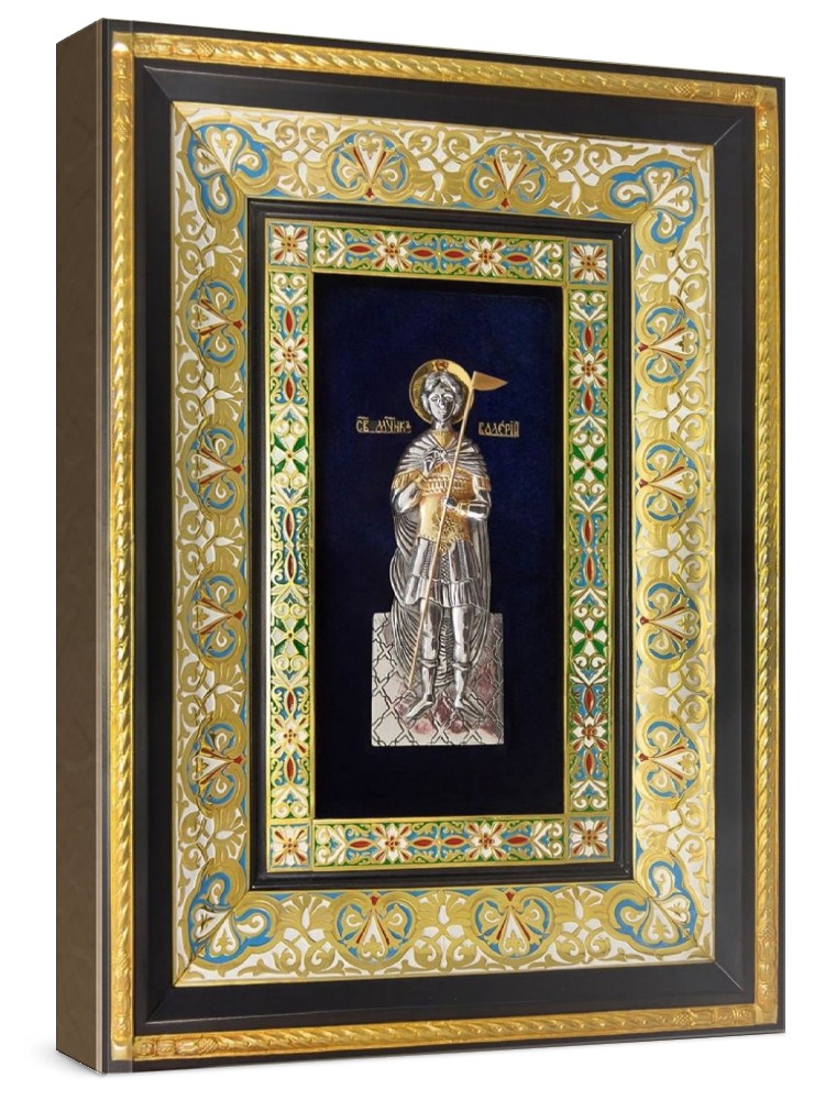 Икона валерий севастийский (29х40), серебро. Икона ручной работы. Образ Святой выполнен из металлической основы, покрытой серебром (толщиной 15 микрон) и золотом (толщиной 2 микрона) методом гальванопластики. Рама изготовлена из ценных пород дерева (ясень), украшена холодной эмалью и покрыта лаком. Размер иконы: 29х40 см. Производство: Россия.