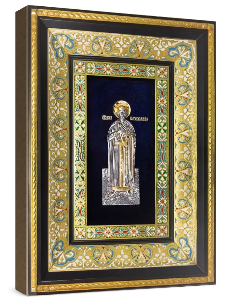 Икона вячеслав чешский (29х40), серебро. Икона ручной работы. Образ Святой выполнен из металлической основы, покрытой серебром (толщиной 15 микрон) и золотом (толщиной 2 микрона) методом гальванопластики. Рама изготовлена из ценных пород дерева (ясень), украшена холодной эмалью и покрыта лаком. Размер иконы: 29х40 см. Производство: Россия.