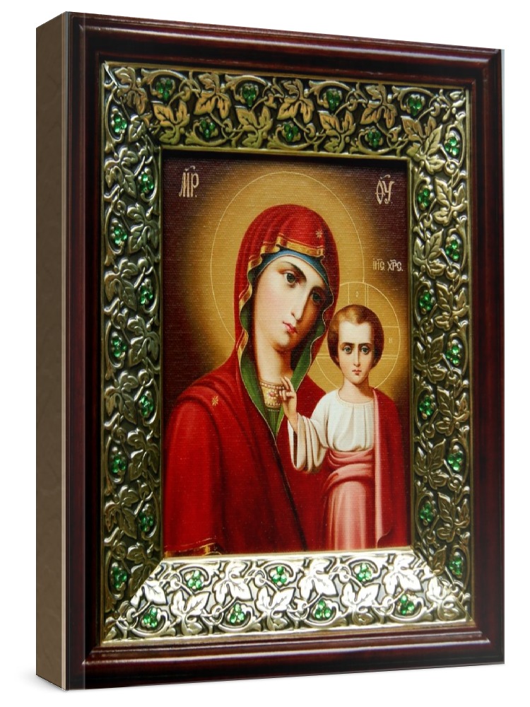 Казанская икона бм (21х24), киот со стразами. Лик нанесен методом шелкографии на художественном холсте и покрыт специальным лаком, что обеспечивает долгую сохранность яркости красок (гарантия - 20 лет). Полный размер иконы с киотом: 21х24 см. Икона под стеклом. Киот (рамка) изготовлен из березы и украшен басмой со стразами (узор из черненой меди в виде виноградной лозы).