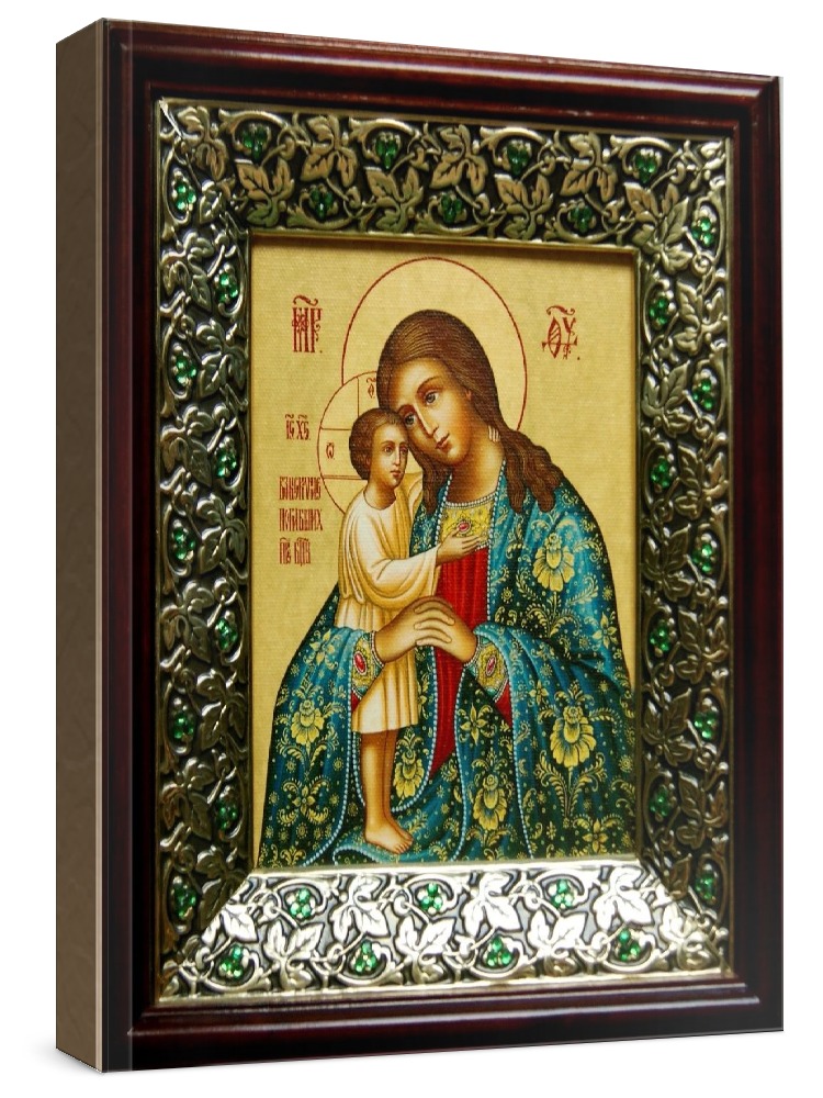 Икона под стеклом. Киот (рамка) изготовлен из березы и украшен басмой со стразами (узор из черненой меди в виде виноградной лозы).