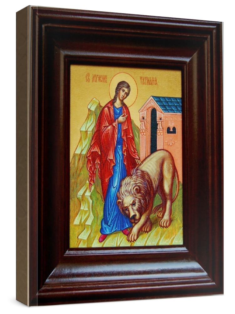Икона татьяна римская (21х24), простой киот. Лик нанесен методом шелкографии на художественном холсте и покрыт специальным лаком, что обеспечивает долгую сохранность яркости красок (гарантия - 20 лет). Полный размер иконы с киотом: 21х24 см. Икона под стеклом. Киот (рамка) изготовлен из березы.