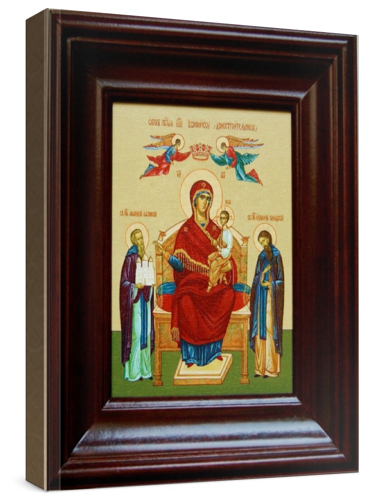 Икона домостроительница (21х24), простой киот. Лик нанесен методом шелкографии на художественном холсте и покрыт специальным лаком, что обеспечивает долгую сохранность яркости красок (гарантия - 20 лет). Полный размер иконы с киотом: 21х24 см. Икона под стеклом. Киот (рамка) изготовлен из березы.