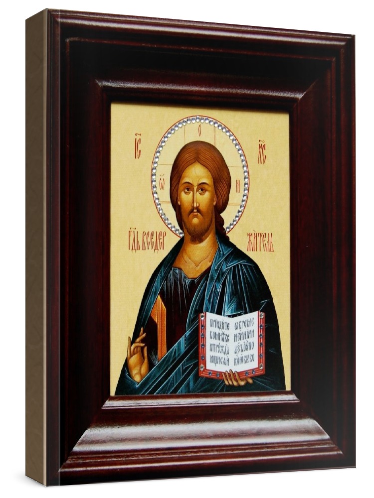 Икона господь вседержитель (21х24), простой киот. Лик нанесен методом шелкографии на художественном холсте и покрыт специальным лаком, что обеспечивает долгую сохранность яркости красок (гарантия - 20 лет). Полный размер иконы с киотом: 21х24 см. Икона под стеклом. Образ украшен стразами. Киот (рамка) изготовлен из березы.