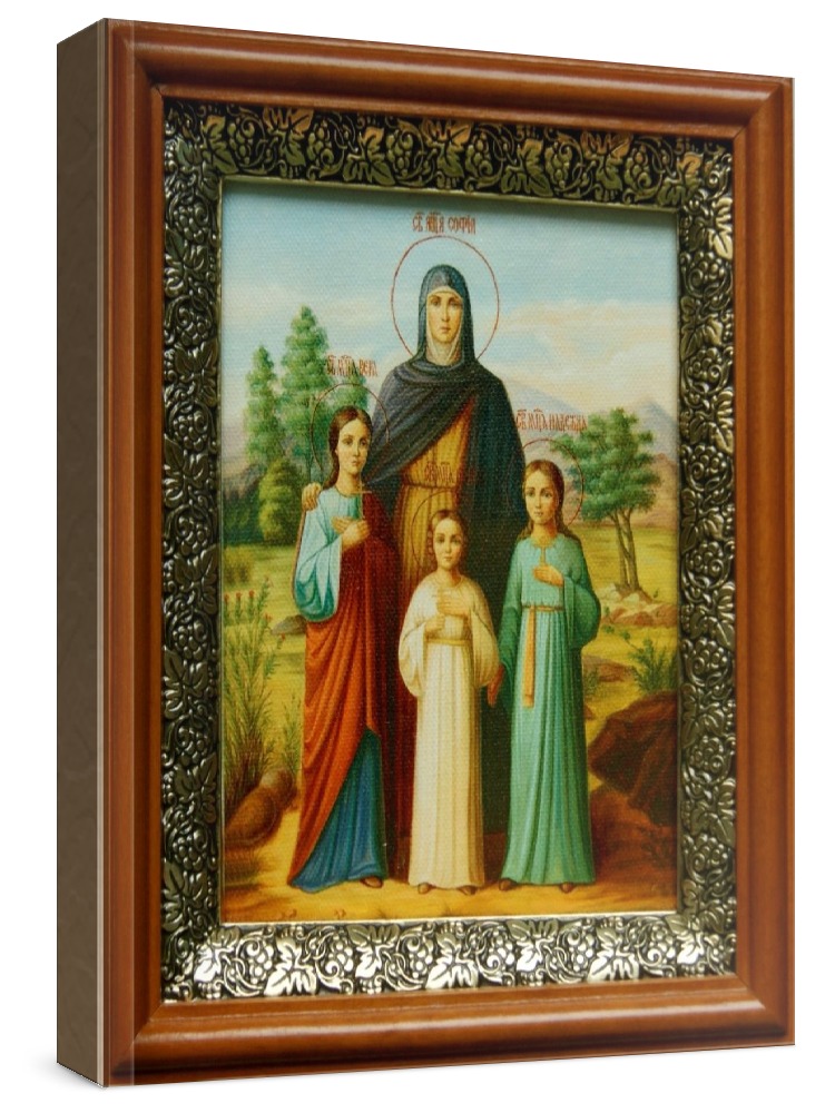 Икона вера, надежда, любовь и софия (19х22), светлый киот. Лик нанесен методом шелкографии на художественном холсте и покрыт специальным лаком, что обеспечивает долгую сохранность яркости красок (гарантия - 20 лет). Полный размер иконы с киотом: 19x22 см. Икона под стеклом. Киот (рамка) изготовлен из березы и украшен басмой (узор из черненой меди в виде виноградной лозы).