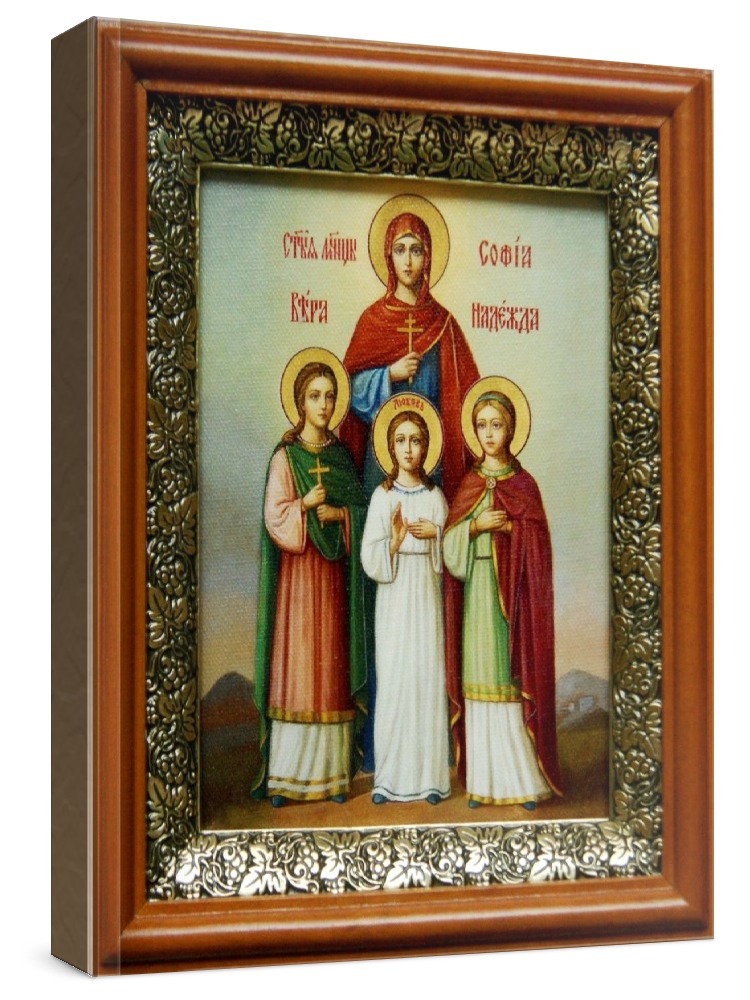Икона вера, надежда, любовь и софия (19х22), светлый киот. Лик нанесен методом шелкографии на художественном холсте и покрыт специальным лаком, что обеспечивает долгую сохранность яркости красок (гарантия - 20 лет). Полный размер иконы с киотом: 19x22 см. Икона под стеклом. Киот (рамка) изготовлен из березы и украшен басмой (узор из черненой меди в виде виноградной лозы).