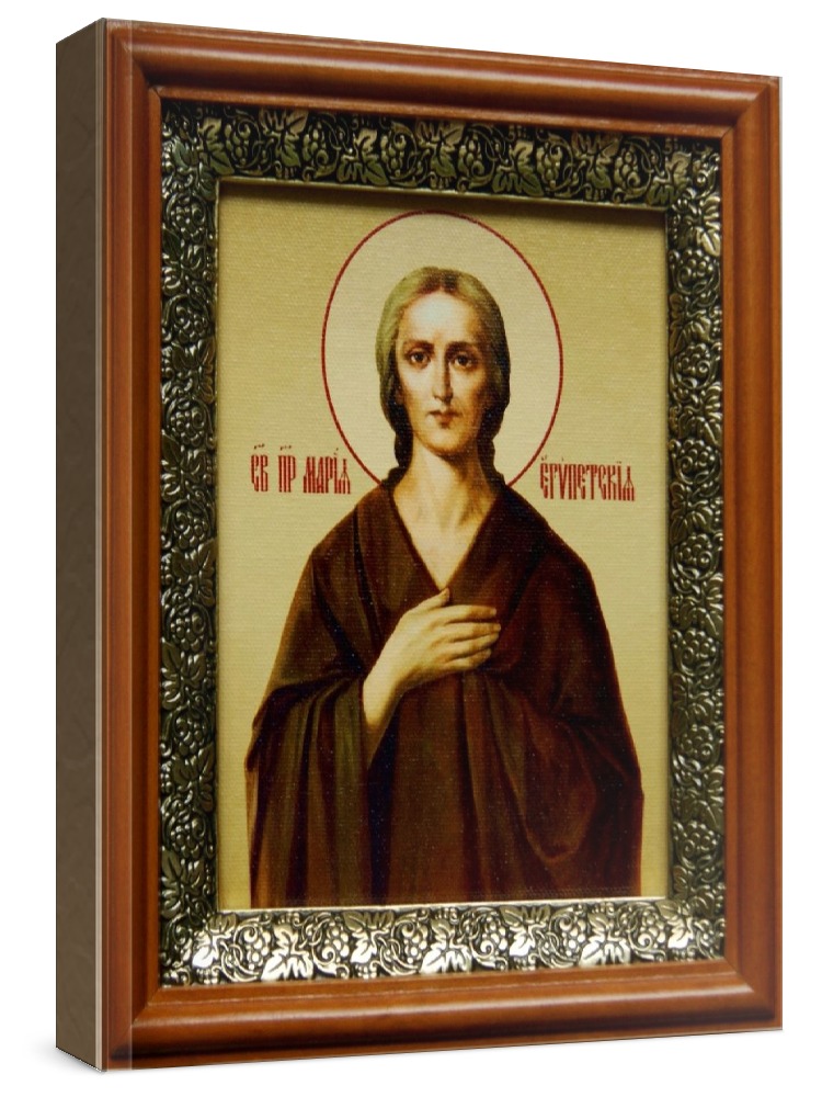 Икона мария египетская (19х22), светлый киот. Лик нанесен методом шелкографии на художественном холсте и покрыт специальным лаком, что обеспечивает долгую сохранность яркости красок (гарантия - 20 лет). Полный размер иконы с киотом: 19x22 см. Икона под стеклом. Киот (рамка) изготовлен из березы и украшен басмой (узор из черненой меди в виде виноградной лозы).