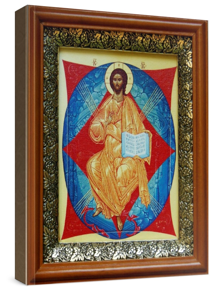Икона спас в силах (19х22), светлый киот. Лик нанесен методом шелкографии на художественном холсте и покрыт специальным лаком, что обеспечивает долгую сохранность яркости красок (гарантия - 20 лет). Полный размер иконы с киотом: 19x22 см. Икона под стеклом. Киот (рамка) изготовлен из березы и украшен басмой (узор из черненой меди в виде виноградной лозы).