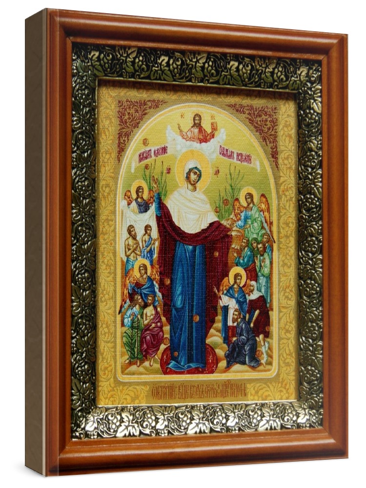 Икона всех скорбящих радость (19х22), светлый киот. Лик нанесен методом шелкографии на художественном холсте и покрыт специальным лаком, что обеспечивает долгую сохранность яркости красок (гарантия - 20 лет). Полный размер иконы с киотом: 19x22 см. Икона под стеклом. Киот (рамка) изготовлен из березы и украшен басмой (узор из черненой меди в виде виноградной лозы).