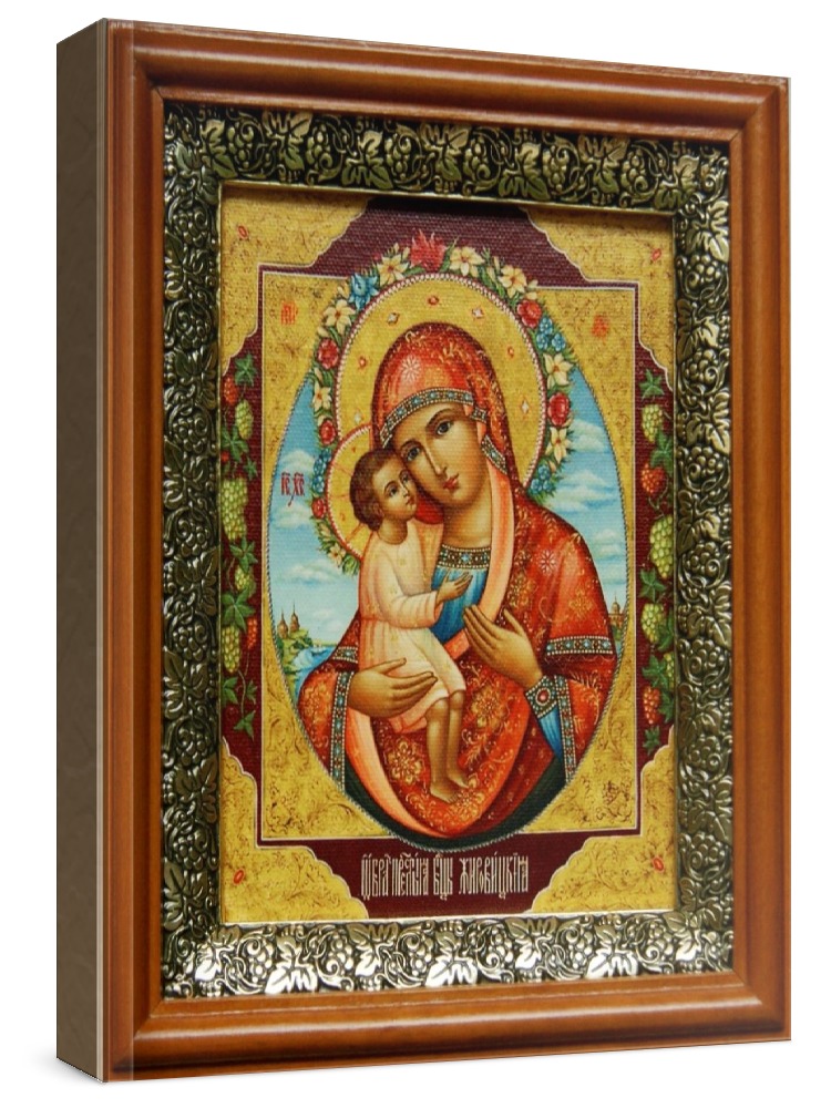Жировицкая икона бм (19х22), светлый киот. Лик нанесен методом шелкографии на художественном холсте и покрыт специальным лаком, что обеспечивает долгую сохранность яркости красок (гарантия - 20 лет). Полный размер иконы с киотом: 19x22 см. Икона под стеклом. Киот (рамка) изготовлен из березы и украшен басмой (узор из черненой меди в виде виноградной лозы).