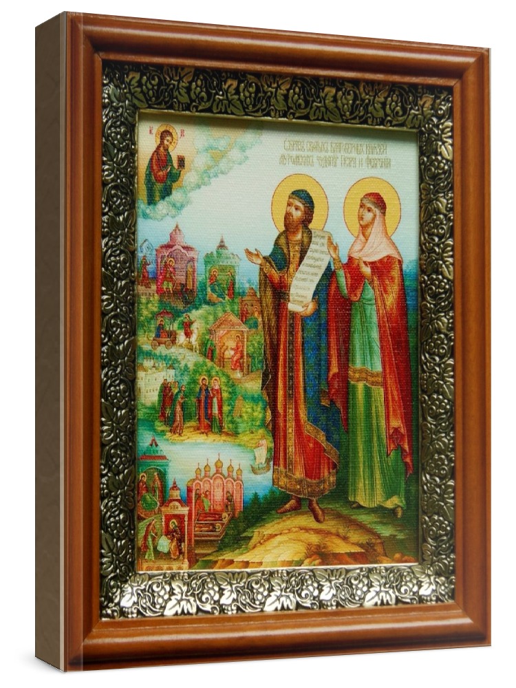 Икона петр и феврония (19х22), светлый киот. Лик нанесен методом шелкографии на художественном холсте и покрыт специальным лаком, что обеспечивает долгую сохранность яркости красок (гарантия - 20 лет). Полный размер иконы с киотом: 19x22 см. Икона под стеклом. Киот (рамка) изготовлен из березы и украшен басмой (узор из черненой меди в виде виноградной лозы).