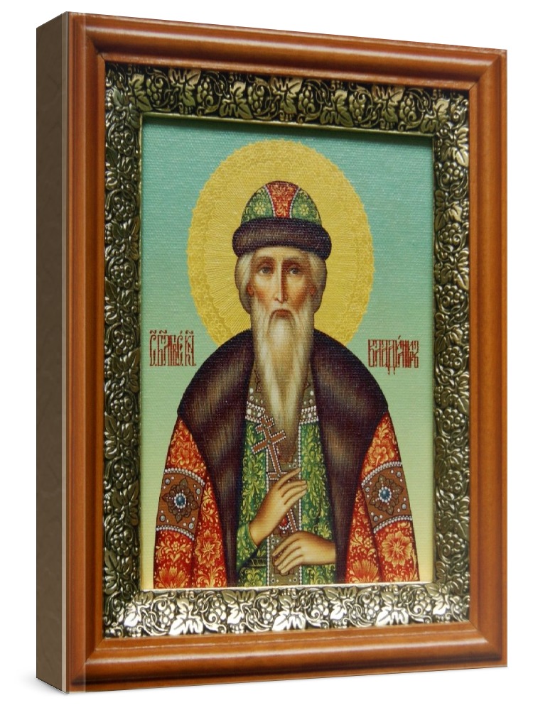 Икона владимир, князь (19х22), светлый киот. Лик нанесен методом шелкографии на художественном холсте и покрыт специальным лаком, что обеспечивает долгую сохранность яркости красок (гарантия - 20 лет). Полный размер иконы с киотом: 19x22 см. Икона под стеклом. Киот (рамка) изготовлен из березы и украшен басмой (узор из черненой меди в виде виноградной лозы).