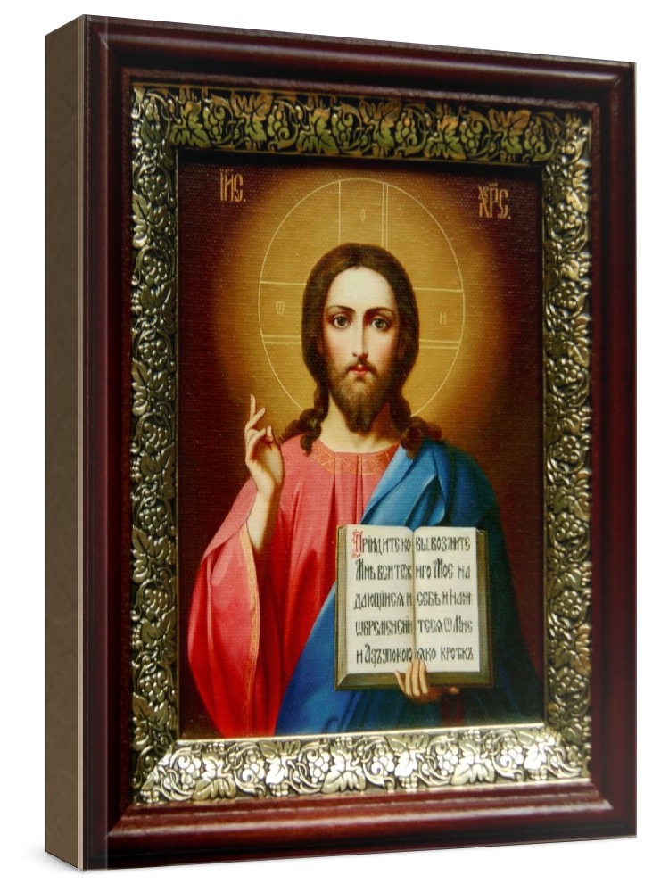Икона господь вседержитель (19х22), темный киот. Лик нанесен методом шелкографии на художественном холсте и покрыт специальным лаком, что обеспечивает долгую сохранность яркости красок (гарантия - 20 лет). Полный размер иконы с киотом: 19x22 см. Икона под стеклом. Киот (рамка) изготовлен из березы и украшен басмой (узор из черненой меди в виде виноградной лозы).