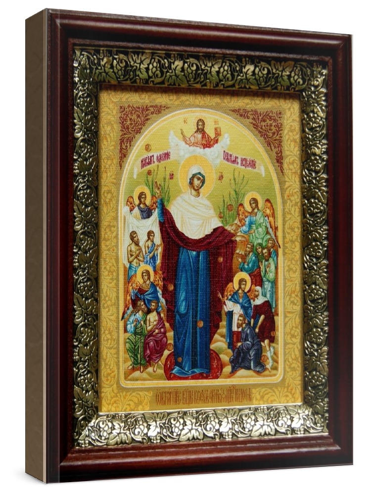 Икона всех скорбящих радость (19х22), темный киот.     Лик нанесен методом шелкографии на художественном холсте и покрыт специальным лаком, что обеспечивает долгую сохранность яркости красок (гарантия - 20 лет).  Полный размер иконы с киотом: 19x22 см.  Икона под стеклом. Киот (рамка) изготовлен из березы и украшен басмой (узор из черненой меди в виде виноградной лозы).