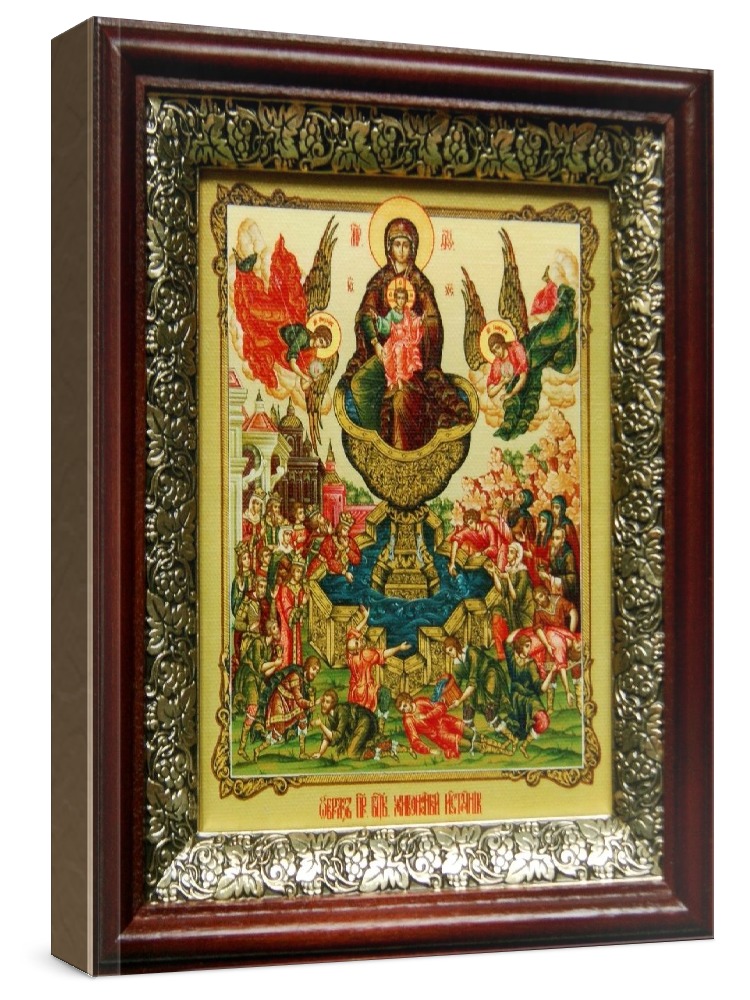 Икона живоносный источник (19х22), темный киот. Лик нанесен методом шелкографии на художественном холсте и покрыт специальным лаком, что обеспечивает долгую сохранность яркости красок (гарантия - 20 лет). Полный размер иконы с киотом: 19x22 см. Икона под стеклом. Киот (рамка) изготовлен из березы и украшен басмой (узор из черненой меди в виде виноградной лозы).