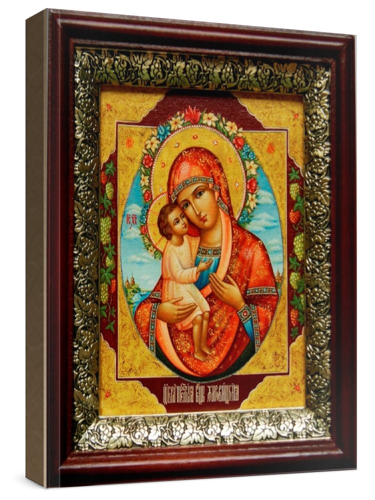 Жировицкая икона бм (19х22), темный киот. Лик нанесен методом шелкографии на художественном холсте и покрыт специальным лаком, что обеспечивает долгую сохранность яркости красок (гарантия - 20 лет). Полный размер иконы с киотом: 19x22 см. Икона под стеклом. Киот (рамка) изготовлен из березы и украшен басмой (узор из черненой меди в виде виноградной лозы).