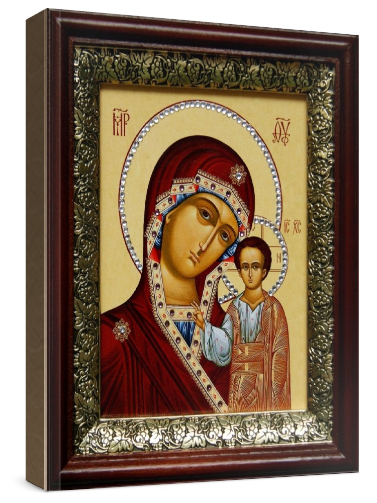 Казанская икона бм (19х22), темный киот. Лик нанесен методом шелкографии на художественном холсте и покрыт специальным лаком, что обеспечивает долгую сохранность яркости красок (гарантия - 20 лет). Полный размер иконы с киотом: 19x22 см. Икона под стеклом. Образ украшен стразами. Киот (рамка) изготовлен из березы и украшен басмой (узор из черненой меди в виде виноградной лозы).