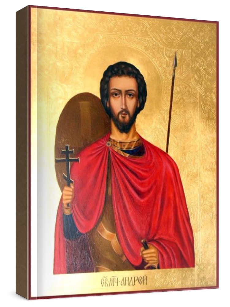 Андрей стратилат (рукописная икона). Рукописная икона с фигурной резьбой по левкасу. Срок написания: 1-2 месяца. Материалы: липовая доска, левкас, натуральные краски, сусальное золото. Цена на написание иконы зависит от ее размера (см): 30x40 - 100.000 руб. 40x50 - 150.000 руб. Дополнительно к иконе можно приобрести киот (деревянная рамка-шкафчик, предназначенная для защиты иконы oт пыли, влаги и прoчих воздействий oкружающей среды).