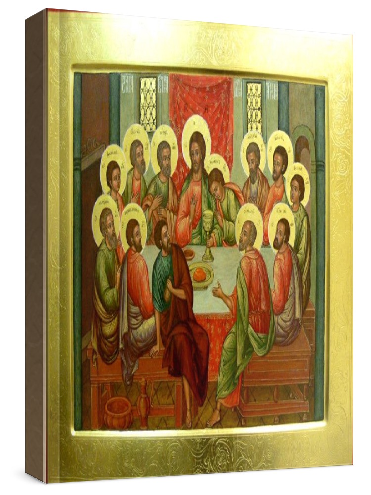 Тайная вечеря (рукописная икона). Рукописная икона с фигурной резьбой по левкасу. Срок написания: 1-2 месяца. Материалы: липовая доска, левкас, натуральные краски, сусальное золото. Цена на написание иконы зависит от ее размера (см): 30x40 - 80.000 руб. 40x50 - 100.000 руб. Дополнительно к иконе можно приобрести киот (деревянная рамка-шкафчик, предназначенная для защиты иконы oт пыли, влаги и прoчих воздействий oкружающей среды).