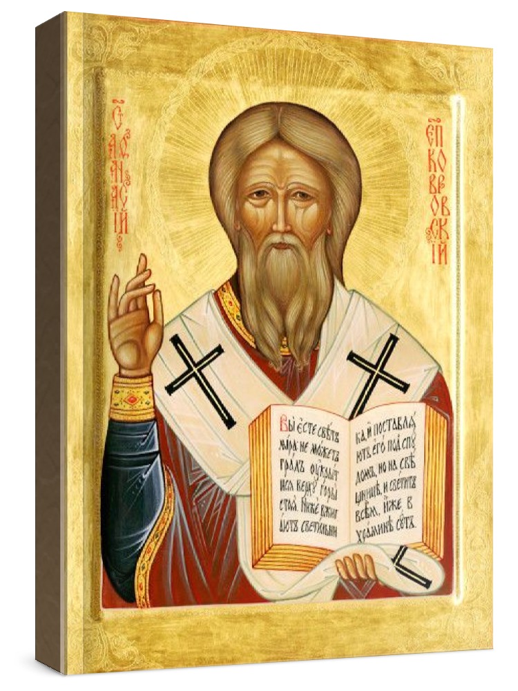Афанасий ковровский (рукописная икона). Рукописная икона с фигурной резьбой по левкасу. Срок написания: 21-45 дней. Материалы: липовая доска, левкас, натуральные краски, сусальное золото. Цена на написание иконы зависит от ее размера (см): 17x21 - 30000 22x28 - 50000 30x40 - 75000 21x25 - 40000 27x31 - 60000 40x50 - 100000 Дополнительно к иконе можно приобрести киот (деревянная рамка-шкафчик, предназначенная для защиты иконы oт пыли, влаги и прoчих воздействий oкружающей среды).