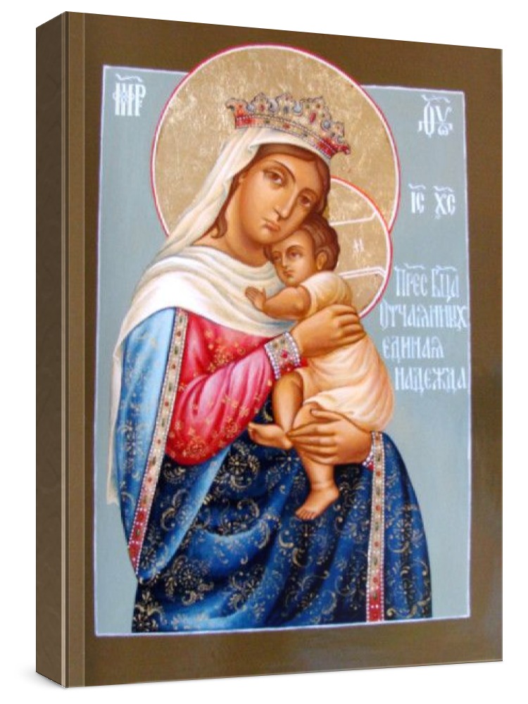 Отчаянных единая надежда (рукописная икона). Рукописная икона на заказ. Срок написания: 5-20 дней (в зависимости от загруженности иконописцев и срочности Вашего заказа). Икона пишется на липовой доске натуральными красками в иконописных мастерских Москвы, Санкт-Петербурга, Липецка или Ярославля. Все иконописцы имеют благословение на написание икон и высшее художественное образование по специальности: иконопись. Цена на написание иконы зависит от ее размера (см): 9x10 - 4000 21x25 - 11000 30x40 - 20000 13x16 - 6000 22x28 - 13000 40x50 - 25000 17x21 - 9000 27x31 - 15000 Дополнительно к иконе можно приобрести киот (деревянная рамка-шкафчик, предназначенная для защиты иконы oт пыли, влаги и прoчих воздействий oкружающей среды).