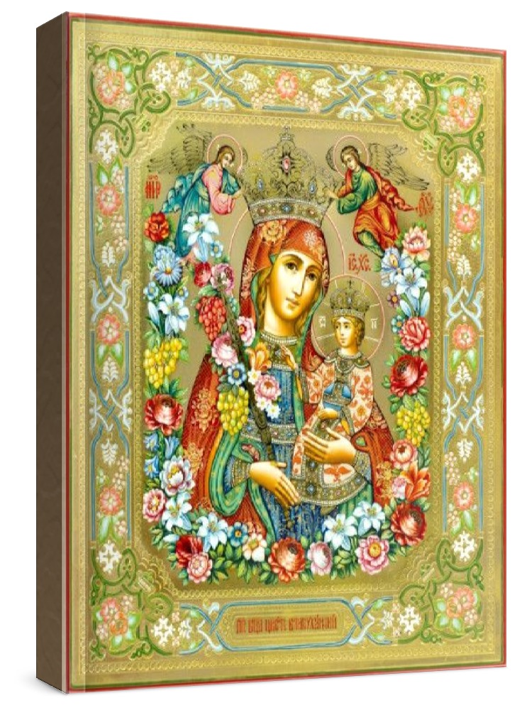 Неувядаемый цвет (рукописная икона). Рукописная икона с фигурной резьбой по левкасу. Срок написания: 1-2 месяца. Материалы: липовая доска, левкас, натуральные краски, сусальное золото. Цена на написание иконы зависит от ее размера (см): 30x40 - 100.000 руб. 40x50 - 130.000 руб.