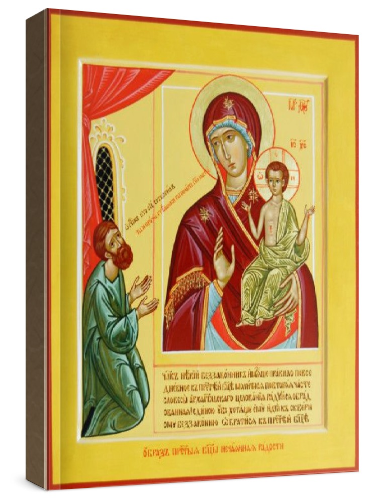 Нечаянная радость (рукописная икона). Рукописная икона на заказ. Срок написания: 5-20 дней (в зависимости от загруженности иконописцев и срочности Вашего заказа). Икона пишется на липовой доске натуральными красками в иконописных мастерских Москвы, Санкт-Петербурга, Липецка или Ярославля. Все иконописцы имеют благословение на написание икон и высшее художественное образование по специальности: иконопись. Цена на написание иконы зависит от ее размера (см): 13x16 - 7000 22x28 - 18000 30x40 - 30000 17x21 - 12000 27x31 - 25000 40x50 - 35000 21x25 - 15000 Дополнительно к иконе можно приобрести киот (деревянная рамка-шкафчик, предназначенная для защиты иконы oт пыли, влаги и прoчих воздействий oкружающей среды).