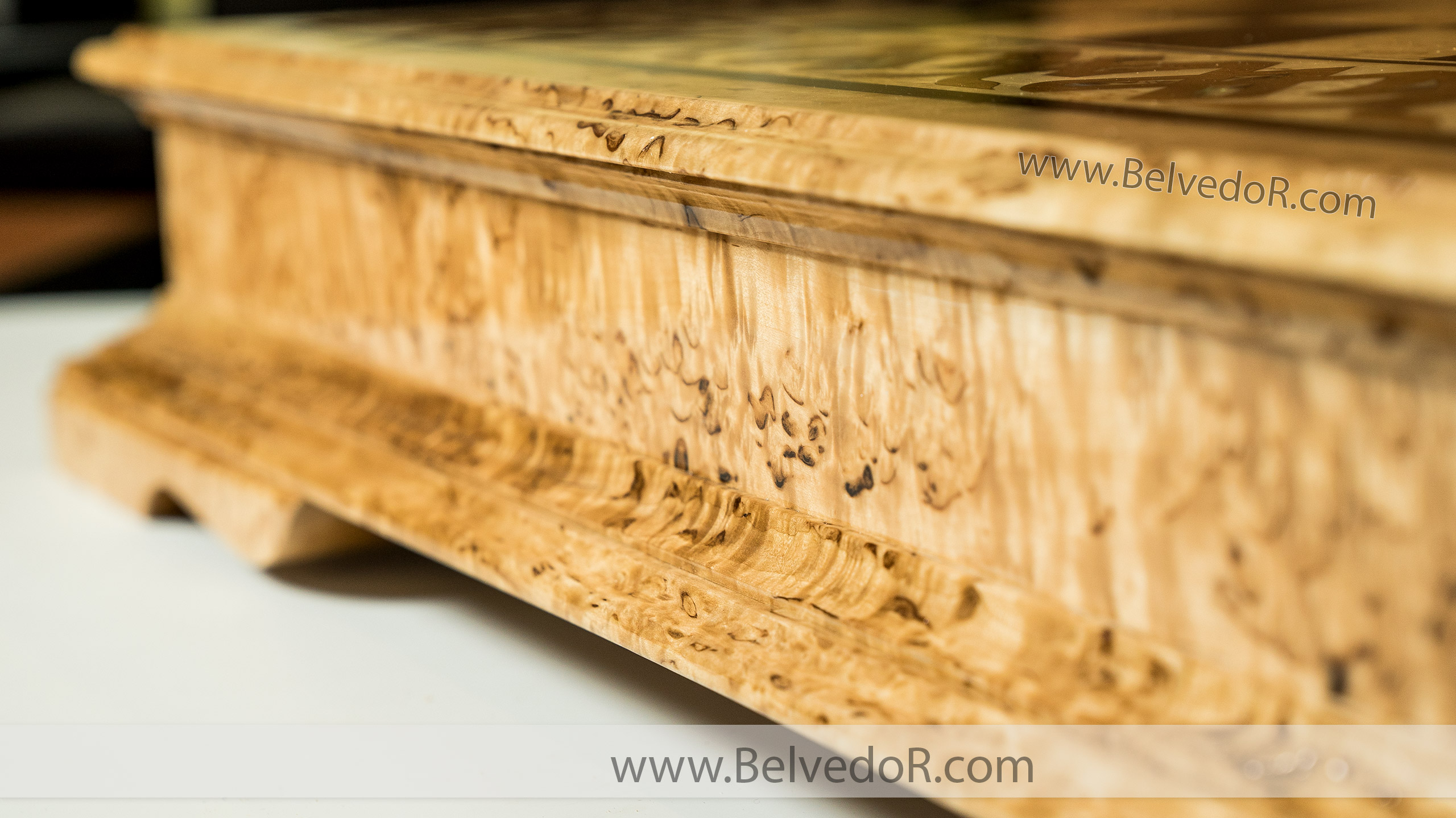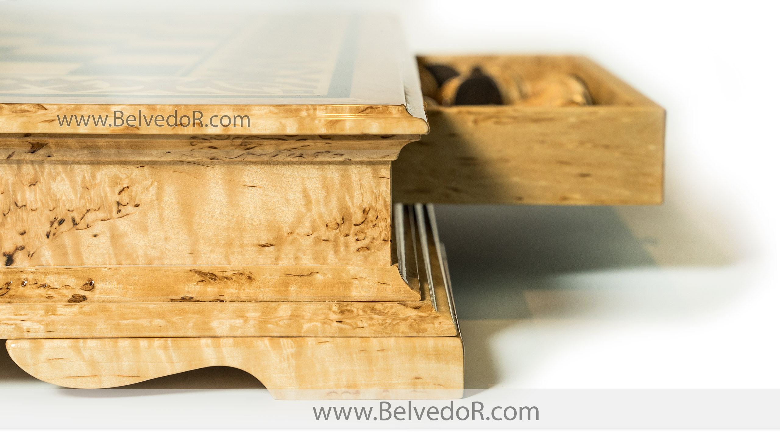 Конечно же, игра в шахматы - она сама по себе - удовольствие, но игра в шахматы на такой доске - удовольствие втройне. Эта царская шахматная доска выполнена из массива карельской березы, которая неповторима своей богатой палитрой золотистых оттенков и причудливой текстурой, рисунком напоминающей мрамор и украшена причудливыми узорами с использованием натурального перламутра. Из-за своих особенностей древесина карельской березы является сверхпрочной и долговечной, поэтому за игрой в наши шахматы с пользой проведет время не одно поколение семьи =). Фигурки для игры, также из карельской березы, в комплекте.