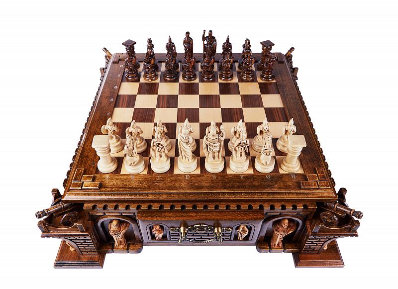 Шахматы резные в ларце пушка, haleyan. Почувствуйте себя на настоящем поле эпичной битвы, пребывая при этом в безопасности. Резные шахматы в ларце «Пушка» предоставляют такую возможность. Изготовленные вручную из буковой древесины талантливым мастером они – настоящее произведение искусства. Углы массивной высокой доски украшены вырезанными пушками. Резные фигуры, стилизованные под воинов, прячутся в выдвижные ящички, вмонтированные по бокам внизу доски. Сама же доска не складывается. Для обеспечения долговечности каждый элемент покрыт защитным лаком.