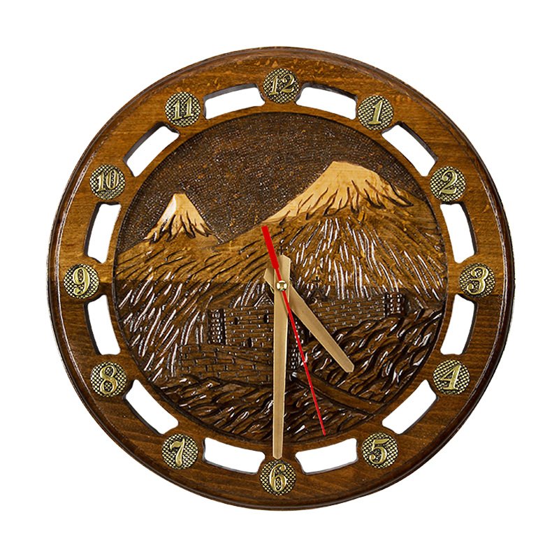 Часы резные 705. Резные часы, выполненные талантливым армянским мастером Кареном Халеяном, станут оригинальным подарком, изысканным украшением и памятной вещью. Премиальное качество изделия прослеживается во всем: профессиональная ручная работа, первоклассные натуральные материалы, тонкая резьба по дереву. Благодаря стильному дизайну эти часы гармонично вписываются в классические интерьеры жилых домов, рабочих кабинетов и офисных помещений. Особенности Для производства используется массив натурального дерева, прочного и долговечного На циферблате вручную вырезано изображение гор, с тонкими линиями и богатой фактурой Специальное лаковое покрытие защищает дерево от прямых солнечных лучей, повышенной влажности и пыли Цифры выполнены из бронзы, которая не боится коррозии и не теряет своего блеска со временем Для удобного хранения можно использовать чехол из мягкой плотной ткани (идет в комплекте) Можно вешать на стену или ставить на красивую подставку Кому понравится такой подарок? Оригинальные резные часы ручного работы от бренда Haleyan станут отличным подарком для ценителей эксклюзива. Их можно подарить семейной паре, близким родственникам и друзьям, начальнику, коллеге или партнеру по бизнесу. Это отличный презент для юбилея и памятной даты.