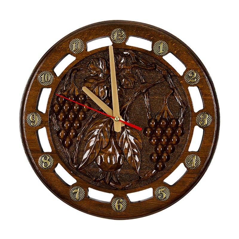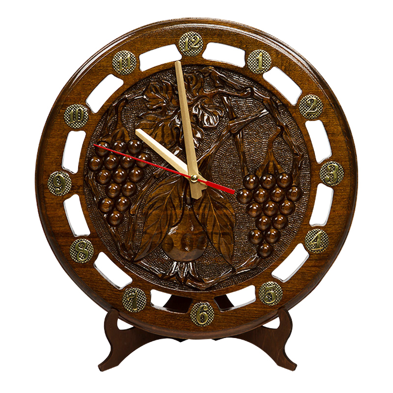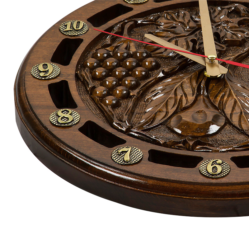 Часы резные 706. Резные часы создавались вручную талантливым мастером, известным далеко за пределами Армении. Каждое изделие Карена Халеяна – это без преувеличения шедевр. Безупречное качество исполнения, внимательное отношение к малейшим деталям, только первоклассные материалы – все это отличает изделия под брендом Haleyan. Они становятся украшением дома, семейной реликвией, которую передаются из поколения в поколение. Особенности Часы выполнены из натурального массива дерева, прочного и долговечного, с красивой текстурой На лицевой части вручную вырезано красивое рельефное изображение виноградной лозы Фактурный узор подчеркивает лаковое покрытие, которое защищает дерево от прямых солнечных лучей, влаги и пыли Цифры выполнены из бронзы, которая не ржавеет и не теряет первоначального блеска Часы можно вешать на стену или ставить на специальную подставку Для удобного хранения и переноски используется чехол из мягкой плотной ткани (идет в комплекте) Кому подарить резные часы? Их можно подарить родным и близким людям, которые обязательно оценят дорогой подарок ручной работы, сделанный от души. Это отличный презент для начальника или делового партнера, коллеги и лучшего друга. Благодаря изысканному дизайну эта модель органично вписывается в классический интерьер, стиль кантри, прованс, ампир.
