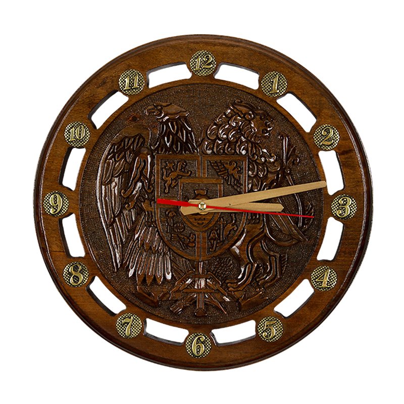 Часы резные 707. Резные часы – вещь неординарная и изысканная, красоту которой обязательно оценят поклонники оригинальных изделий ручной работы. Первоклассное качество материалов, высокое мастерство исполнения, превосходное декорирование поверхности – все это в гармонии сочетается в часах от бренда Haleyan. Талантливый мастер Армении Карен Халеян создает настоящие шедевры из натурального дерева. В изделиях под его именем чувствуется элегантный стиль и особенное очарование. Здесь каждая линия доведена до совершенства. Особенности Часы выполнены из массива прочного и долговечного дерева На лицевой части вручную вырезано изображение герба Армении, в котором воплощаются определенные этапы истории армянского народа Структуру вырезанного рисунка подчеркивает лаковое покрытие. Оно придает поверхности легкого благородного блеска и защищает дерево от солнечных лучей, влаги и пыли Цифры выполнены из бронзы. Часы можно вешать на стену или ставить на подставку Для удобного хранения и переноски можно использовать чехол из мягкой плотной ткани дизайн часов подходит для помещений, оформленных в стиле классики, ампира, кантри, прованса. Кому понравятся резные часы? Эти часы будут радовать вас долгие годы, они станут оригинальным подарком и понравятся ценителям эксклюзива с тонким вкусом. Такой презент обязательно оценят родные и друзья, начальник и коллеги, деловые партнеры и люди, которые вам дороги. Если вы ищите необычный и красивый подарок на юбилей, день рождение или любое другое памятное событие, тогда эти часы станут отличным выбором.