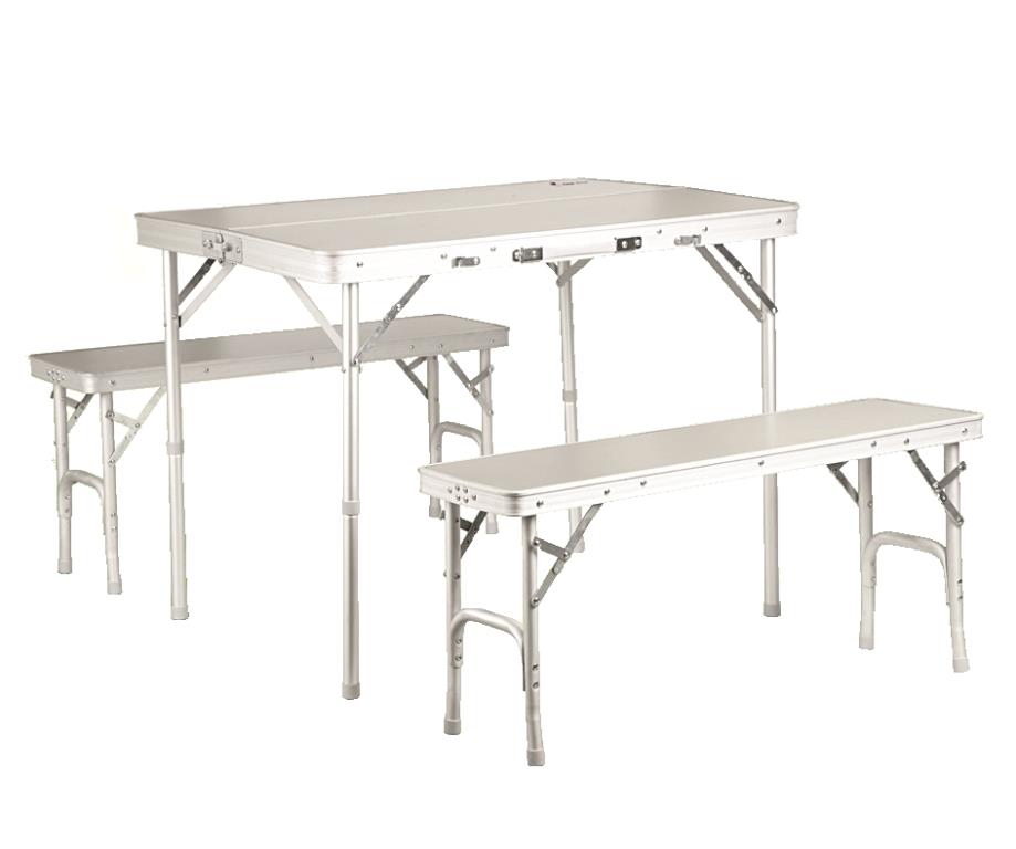 Набор мебели для пикника 5909. Удобный и компактный набор складной мебели просто незаменим для отдыха на природе в компании друзей и близких. Каркас изделия изготовлен из алюминия, который обеспечит продолжительный срок службы данного изделия. Скамейки убираются внутрь стола, поэтому всю конструкцию можно хранить в помещении, так как она не займет много места. Для удобства перевозки изделия имеется специальная ручка для переноски. • Размер стола: 90х65х69 см • Количество скамеек: 2 штуки • Размер скамеек: 87х25х40 см • Размер в сложенном виде (ДхШхВ): 95х45х12 см • Вес нетто: 10,1 кг • Материал: МДФ • Каркас: алюминиевая труба с матовой поверхностью (диаметр 22/25 мм) • Цвет: белый • Размер упаковки: 94,5х12х44 см • Вес брутто: 11,1 кг • Производитель: Green Glade • Страна: Китай