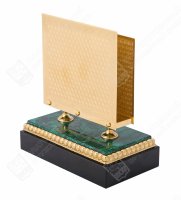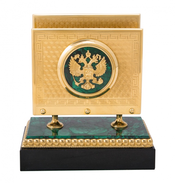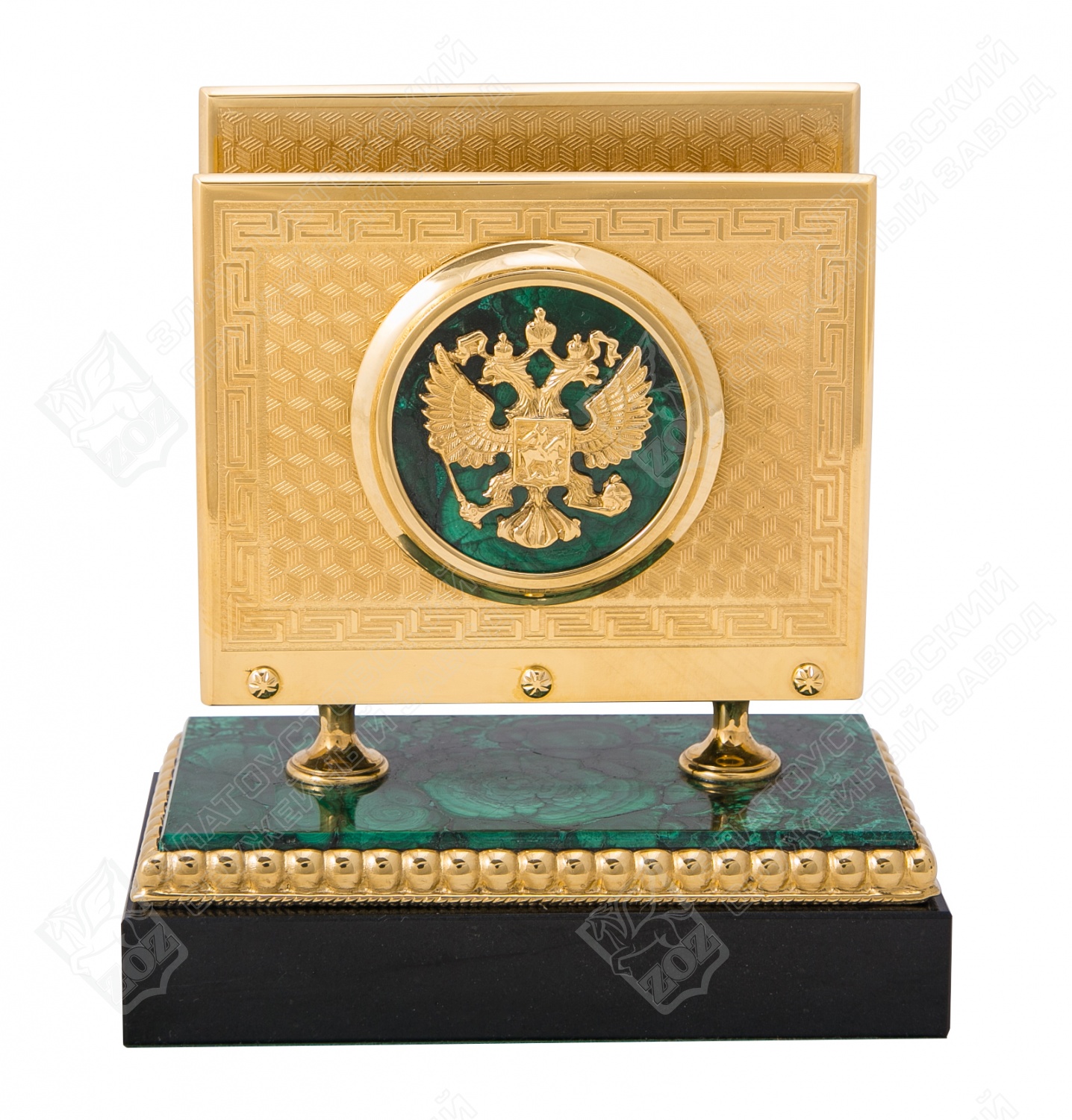 Визитница настольная герб рф из малахита златоуст. Материал: малахит, латунь. Покрытия: золотом 999,9; никелем. Техника исполнения: токарные и слесарные работы, рисовка кистью на металле, многоступенчатая гравировка иглой по лаку, травление, ручная подрезка, полировка. Размеры: высота 130 мм. ширина 120 мм. глубина 70 мм. Покрытие Гальванический метод