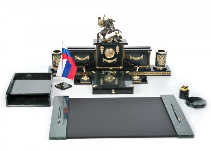 Настольный набор из зеленого мрамора с лошадками. Настольный набор из мрамора включает в себя: Часы настольные с фигурками коней - 1шт. Подставки под письменные принадлежности - 2шт. Подставки под бумаги - 2шт. Флаг на флагштоке - 1шт. Визитница - 2шт. Пепельница - 1шт. Ручки - 2шт. Ящик для письменных предметов - 1шт. Зажигалка - 1шт. Подставка под календарь - 1шт. Накопитель для А4 бумаги-1шт. Коврик-1шт. Подиум из мрамора,украшенный позолоченными узорами -1шт. По вашим пожеланиям можно изменить комплектацию набора.
