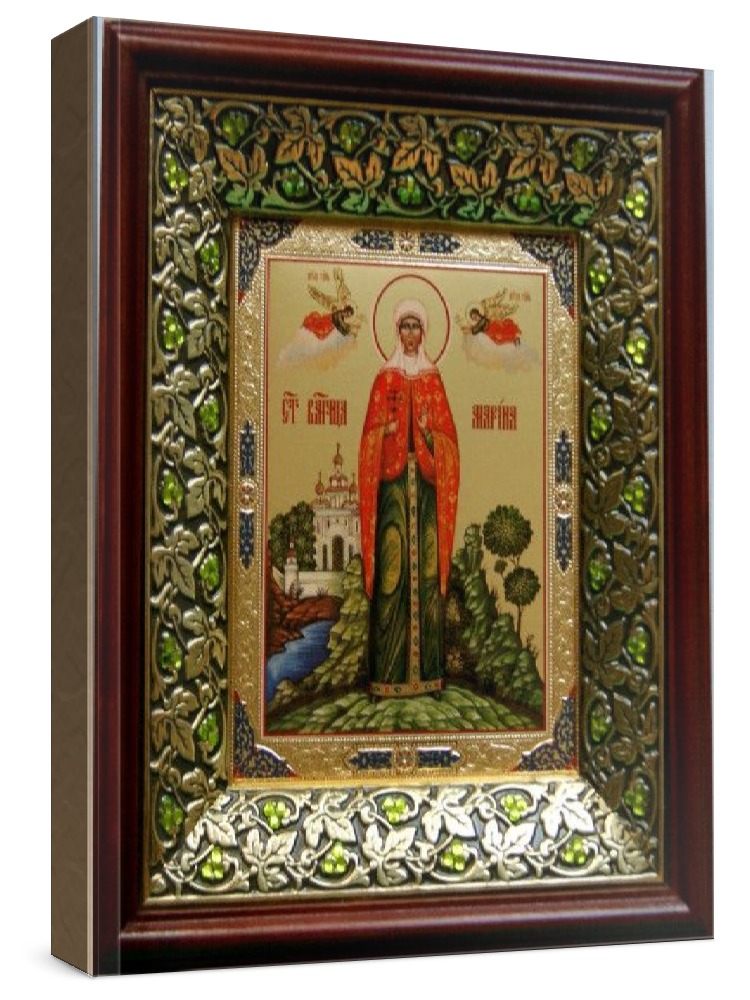 Икона марина антиохийская (21х24), киот со стразами. Лик нанесен методом объемного тиснения фолиевыми красками по золотой фольге, что гарантирует максимально долгую сохранность яркости изображения. Полный размер иконы с киотом: 21x24 см. Икона под стеклом. Киот (рамка) изготовлен из березы и украшен басмой со стразами (узор из черненой меди в виде виноградной лозы).