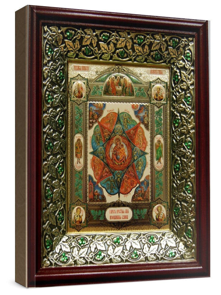 Икона неопалимая купина (21х24), киот со стразами. Лик нанесен методом объемного тиснения фолиевыми красками по золотой фольге, что гарантирует максимально долгую сохранность яркости изображения. Полный размер иконы с киотом: 21x24 см. Икона под стеклом. Киот (рамка) изготовлен из березы и украшен басмой со стразами (узор из черненой меди в виде виноградной лозы).