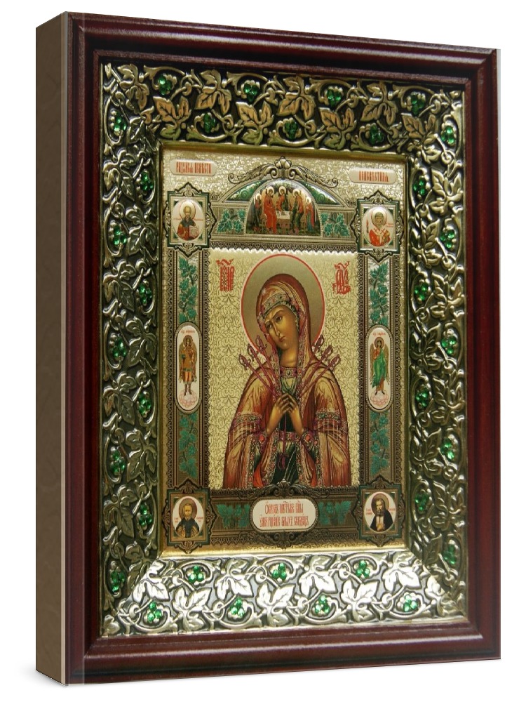 Икона умягчение злых сердец (21х24), киот со стразами. Лик нанесен методом объемного тиснения фолиевыми красками по золотой фольге, что гарантирует максимально долгую сохранность яркости изображения. Полный размер иконы с киотом: 21x24 см. Икона под стеклом. Киот (рамка) изготовлен из березы и украшен басмой со стразами (узор из черненой меди в виде виноградной лозы).
