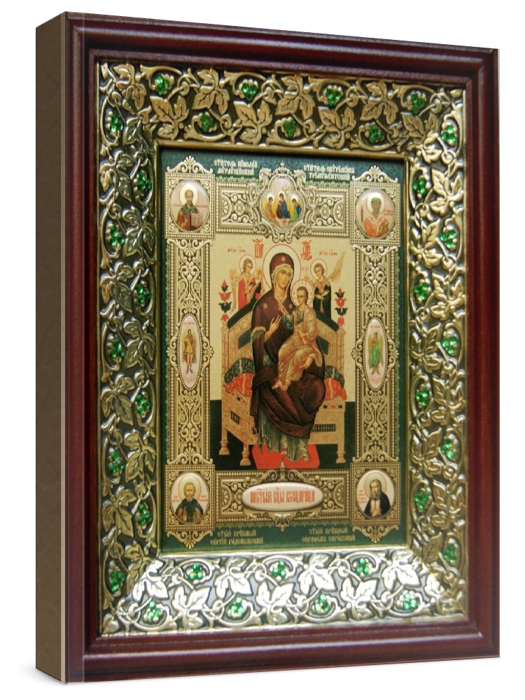 Икона всецарица (21х24), киот со стразами. Лик нанесен методом объемного тиснения фолиевыми красками по золотой фольге, что гарантирует максимально долгую сохранность яркости изображения. Полный размер иконы с киотом: 21x24 см. Икона под стеклом. Киот (рамка) изготовлен из березы и украшен басмой со стразами (узор из черненой меди в виде виноградной лозы).