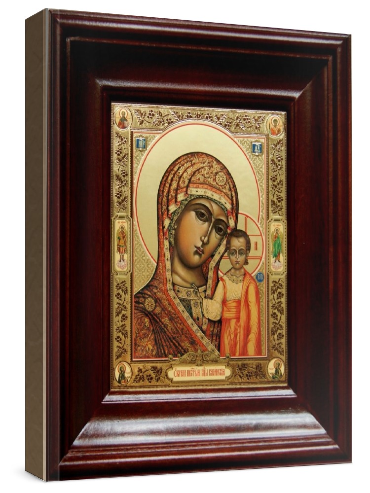 Венчальная пара 7. казанская икона бм (21х24). Лик нанесен методом объемного тиснения фолиевыми красками по золотой фольге, что гарантирует максимально долгую сохранность яркости изображения. Полный размер иконы с киотом: 21x24 см. Киот (рамка) изготовлен из березы. Икона под стеклом.