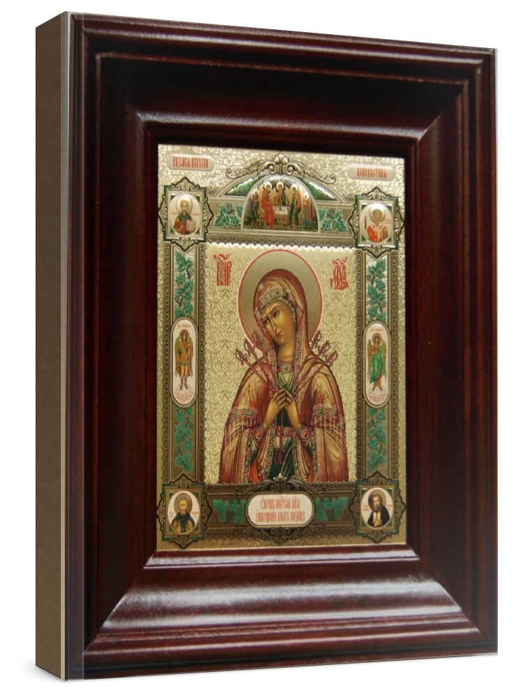 Икона умягчение злых сердец (21х24), простой киот. Лик нанесен методом объемного тиснения фолиевыми красками по золотой фольге, что гарантирует максимально долгую сохранность яркости изображения. Полный размер иконы с киотом: 21x24 см. Киот (рамка) изготовлен из березы. Икона под стеклом.