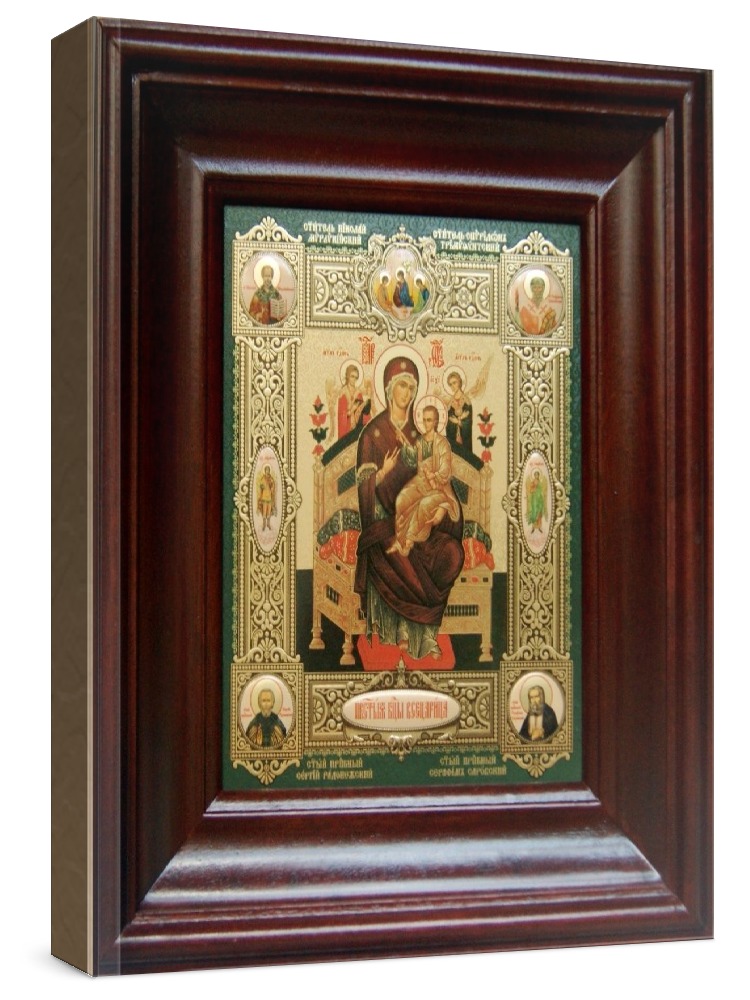 Икона всецарица (21х24), простой киот. Лик нанесен методом объемного тиснения фолиевыми красками по золотой фольге, что гарантирует максимально долгую сохранность яркости изображения. Полный размер иконы с киотом: 21x24 см. Киот (рамка) изготовлен из березы. Икона под стеклом.