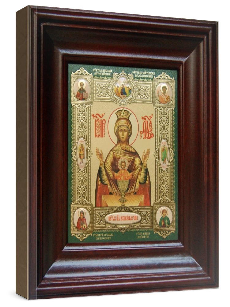 Икона неупиваемая чаша (21х24), простой киот. Лик нанесен методом объемного тиснения фолиевыми красками по золотой фольге, что гарантирует максимально долгую сохранность яркости изображения. Полный размер иконы с киотом: 21x24 см. Киот (рамка) изготовлен из березы. Икона под стеклом.