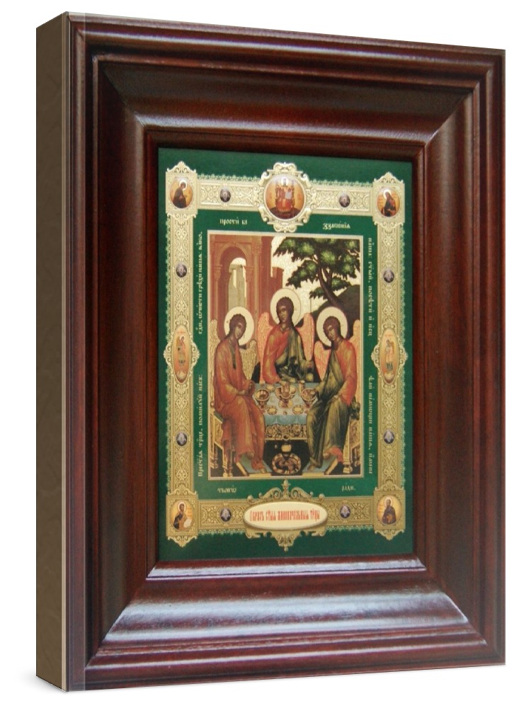 Икона троица (21х24), простой киот. Лик нанесен методом объемного тиснения фолиевыми красками по золотой фольге, что гарантирует максимально долгую сохранность яркости изображения. Полный размер иконы с киотом: 21x24 см. Киот (рамка) изготовлен из березы. Икона под стеклом.