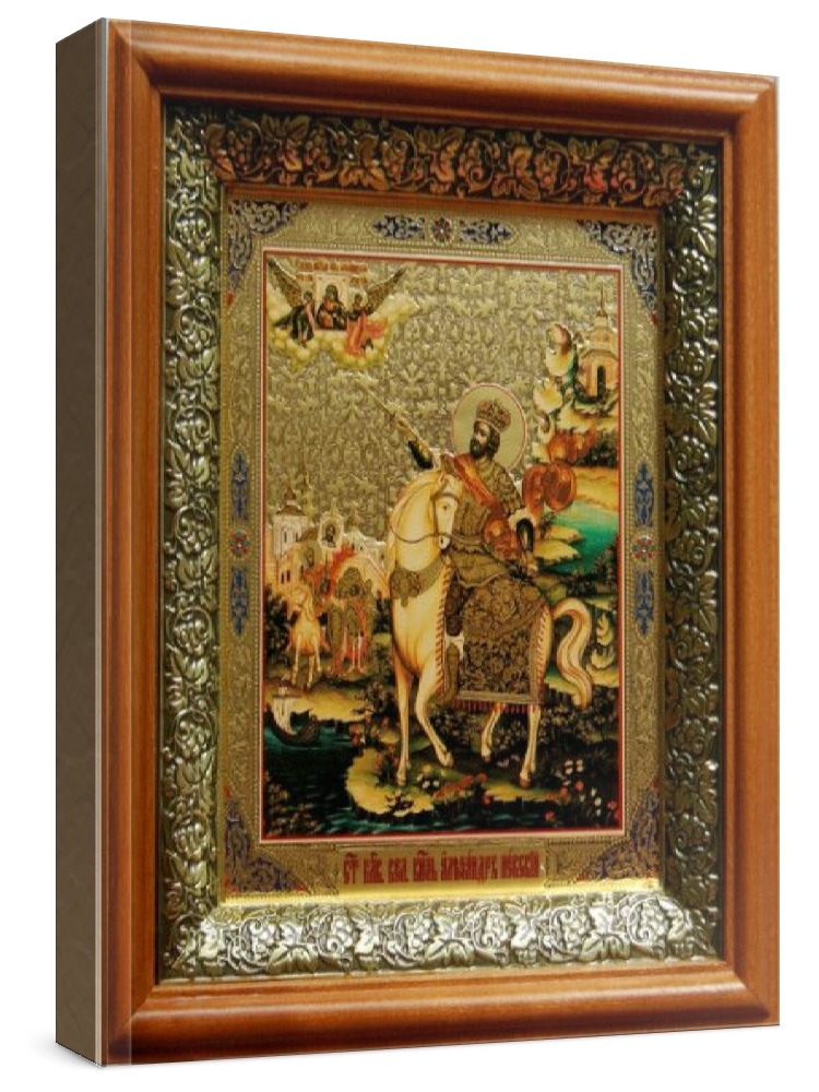 Икона александр невский (19х22), светлый киот. Лик нанесен методом объемного тиснения фолиевыми красками по золотой фольге, что гарантирует максимально долгую сохранность яркости изображения. Полный размер иконы с киотом: 19x22 см. Икона под стеклом. Киот (рамка) изготовлен из березы и украшен басмой (узор из черненой меди в виде виноградной лозы).