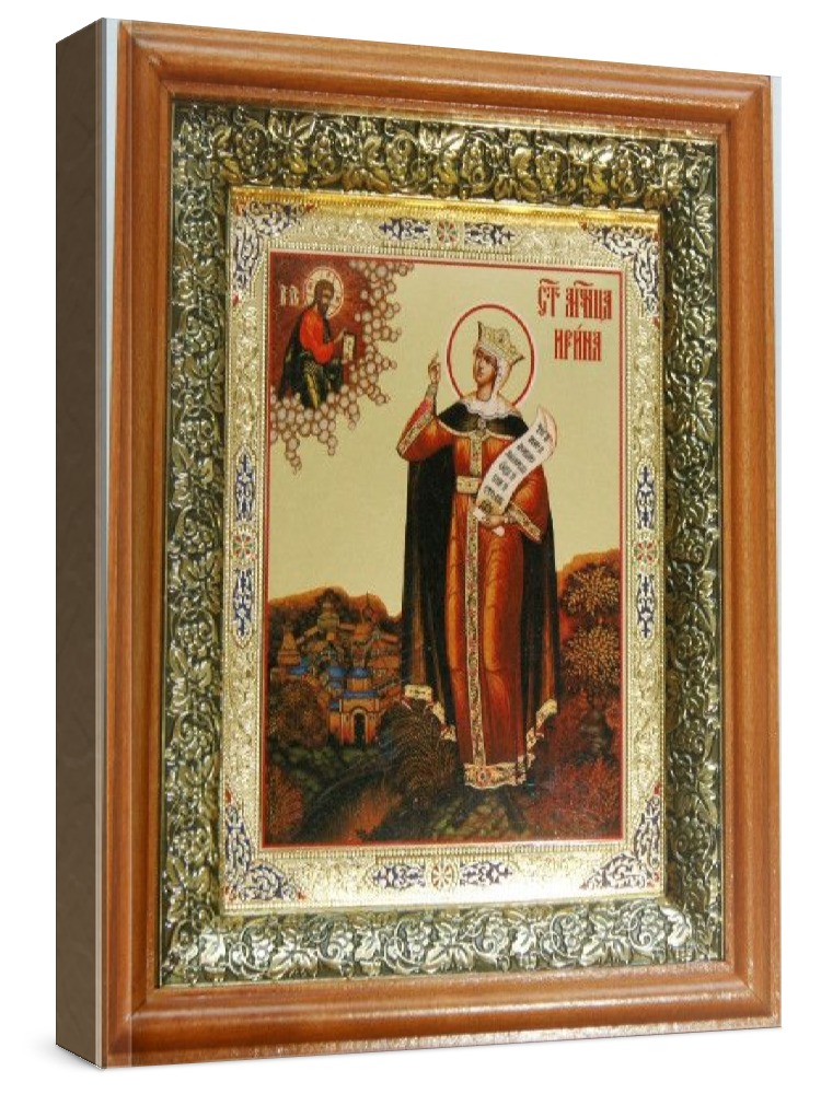 Икона ирина македонская (19х22), светлый киот. Лик нанесен методом объемного тиснения фолиевыми красками по золотой фольге, что гарантирует максимально долгую сохранность яркости изображения. Полный размер иконы с киотом: 19x22 см. Икона под стеклом. Киот (рамка) изготовлен из березы и украшен басмой (узор из черненой меди в виде виноградной лозы).