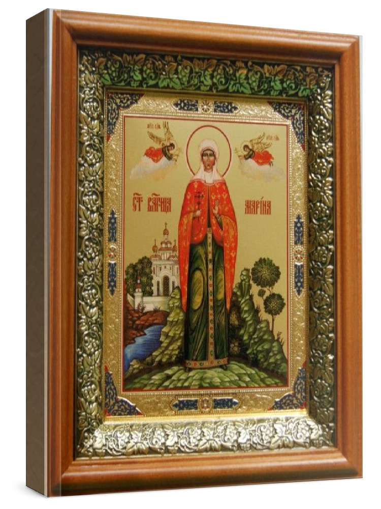 Икона марина антиохийская (19х22), светлый киот. Лик нанесен методом объемного тиснения фолиевыми красками по золотой фольге, что гарантирует максимально долгую сохранность яркости изображения. Полный размер иконы с киотом: 19x22 см. Икона под стеклом. Киот (рамка) изготовлен из березы и украшен басмой (узор из черненой меди в виде виноградной лозы).